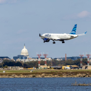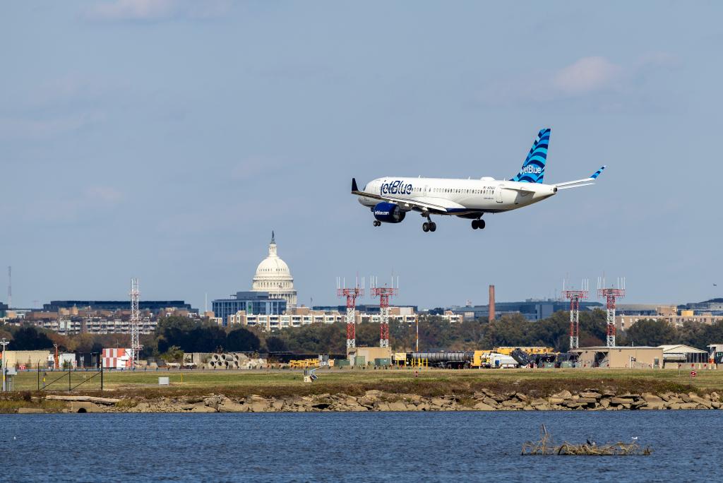 11月1日,一架飛機降落在美國弗吉尼亞州阿靈頓的里根國家機場。新華社記者胡友松攝