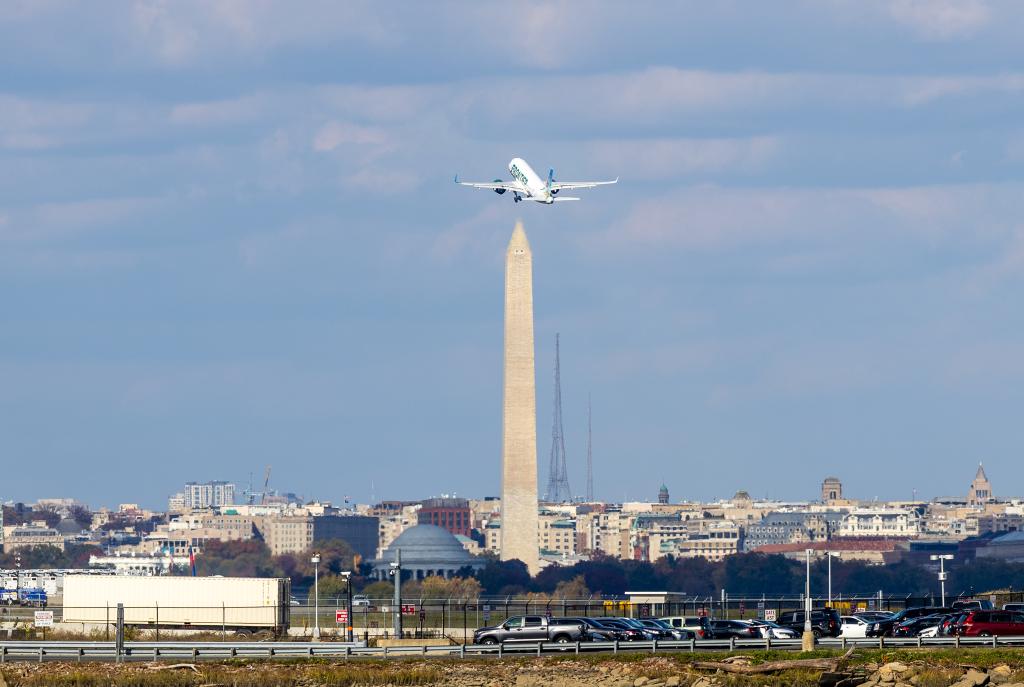11月1日,一架飛機從美國弗吉尼亞州阿靈頓的里根國家機場起飛。新華社記者胡友松攝
