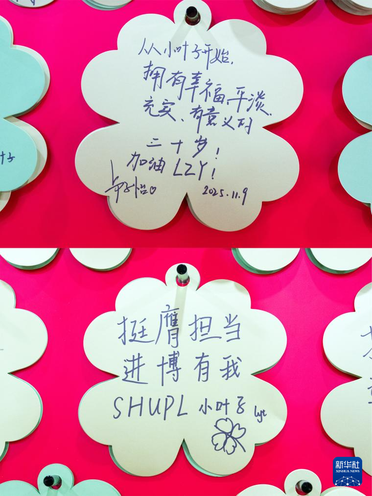 在第八屆進博會的志愿者之家拍攝的留言墻(拼版照片,均攝于11月10日)。