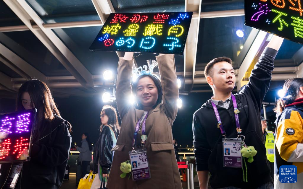 11月10日,在國家會展中心(上海)舉行的第八屆進博會志愿者離園儀式上,工作人員舉著燈牌送別“小葉子”。