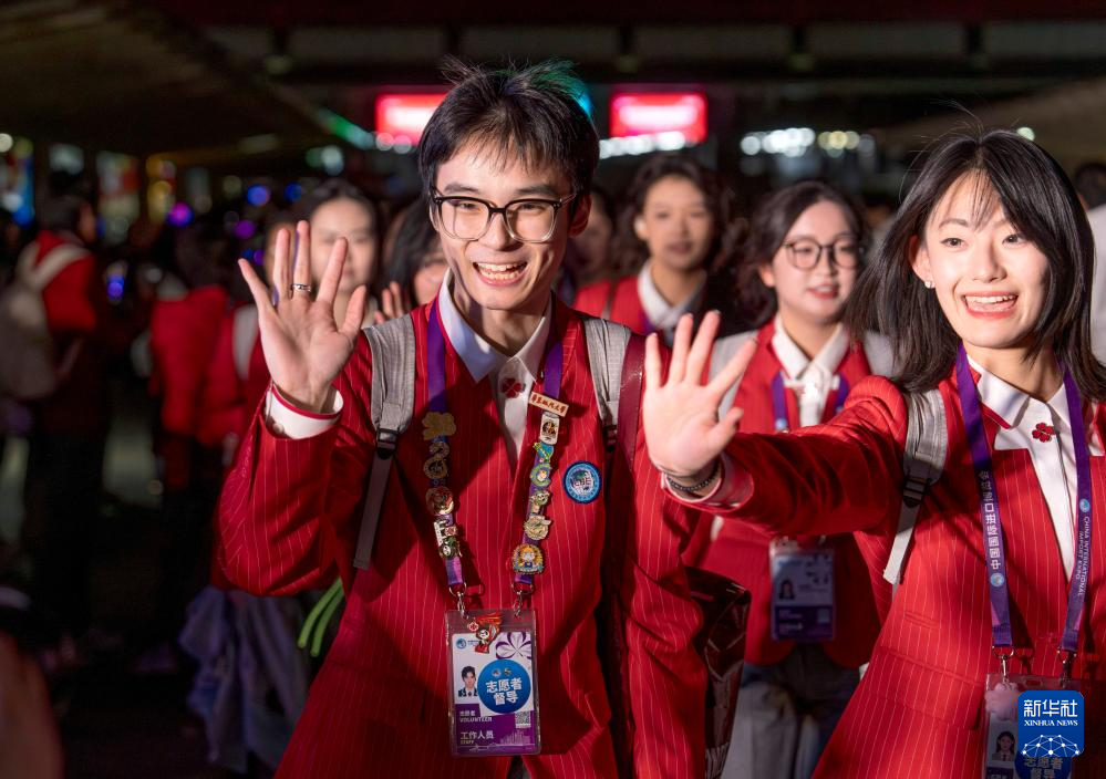 11月10日,在國家會展中心(上海)舉行的第八屆進博會志愿者離園儀式上,“小葉子”們互相告別。