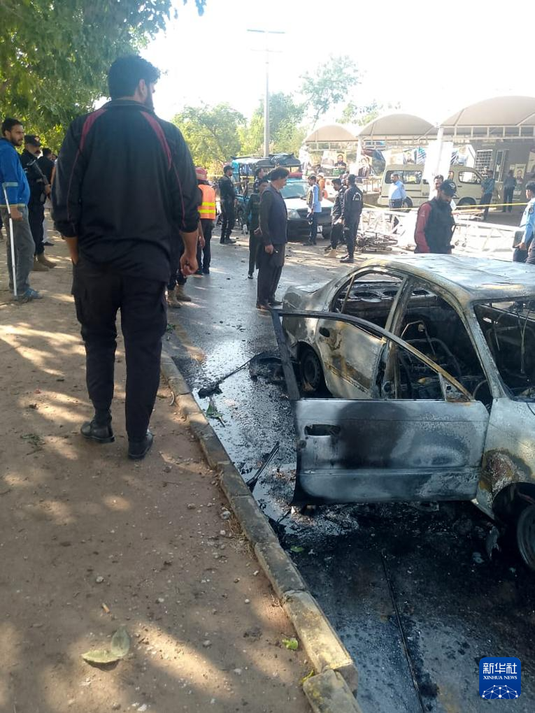 11月11日,在巴基斯坦首都伊斯蘭堡,安全和救援人員檢查爆炸現場(手機照片)。新華社發