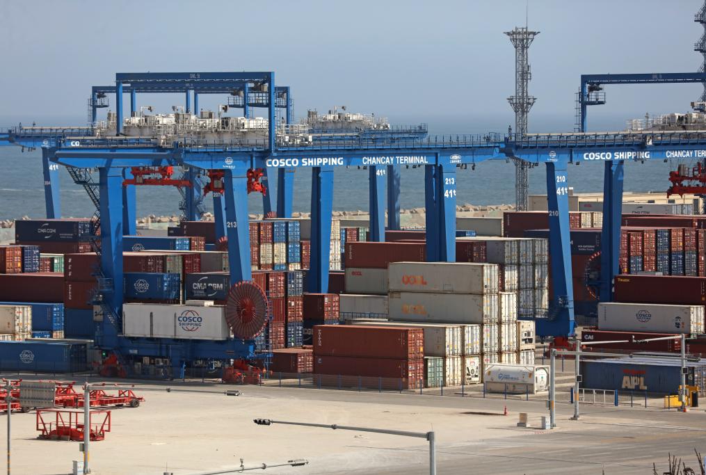 這是2025年10月7日拍攝的秘魯錢凱港碼頭擺放的集裝箱。位于秘魯首都利馬以北約80公里的錢凱港于2024年11月正式開港,標志著中秘共建“一帶一路”取得新的重要成果。新華社發(瑪麗安娜·巴索攝)