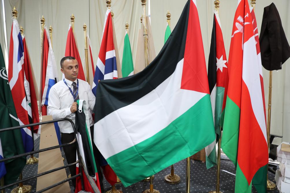 10月13日,在埃及沙姆沙伊赫,一名工作人員在沙姆沙伊赫峰會的媒體中心整理巴勒斯坦國旗。新華社記者隋先凱攝