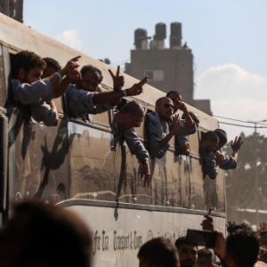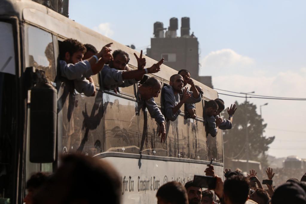 10月13日,巴勒斯坦獲釋人員乘坐大巴回到加沙地帶南部汗尤尼斯。新華社發(里澤克·阿卜杜勒賈瓦德攝)