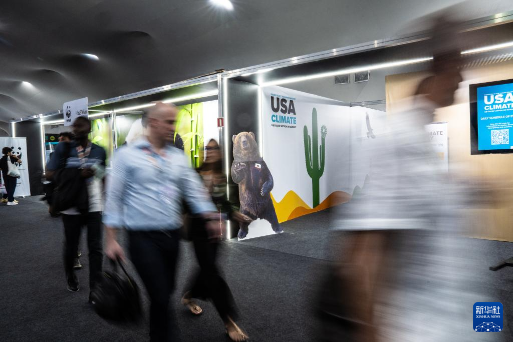 11月17日,在巴西貝倫舉行的《聯合國氣候變化框架公約》第三十次締約方大會(COP30)上,人們走過“美國館”。 新華社記者 王天聰 攝