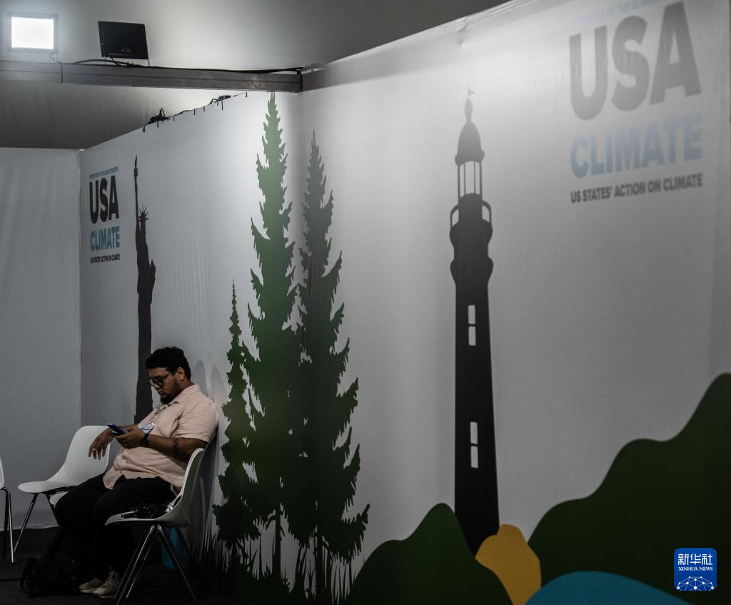 11月17日,在巴西貝倫舉行的《聯合國氣候變化框架公約》第三十次締約方大會(COP30)上,一名男子坐在“美國館”內。 新華社記者 王天聰 攝