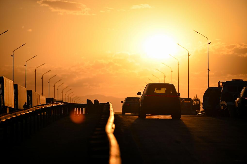 5月22日,運輸公司工作人員駕駛從中國進口的新能源汽車駛出哈薩克斯坦口岸,駛向扎爾肯特鎮的中轉停車場。新華社記者李任滋攝