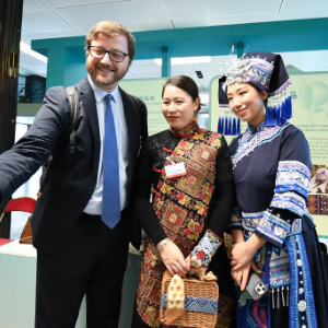 11月17日,在瑞士日內瓦世界知識產權組織總部,一名參觀者在“中國(廣西)地理標志產品展”上與身著民族服飾的工作人員合影。