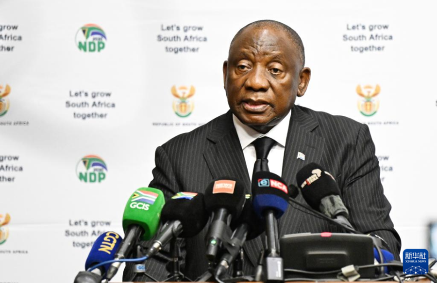 2024年12月3日,在南非開普敦,南非總統拉馬福薩在南非擔任G20輪值主席國啟動儀式上發表講話。新華社發(哈比索·姆卡貝拉攝)