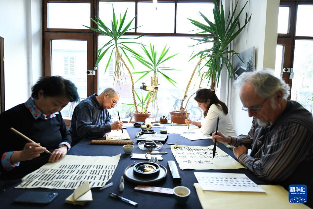 11月19日,在瑞士日內瓦,“樂魚亭”書法工作室的學員在練習書法。新華社記者 連漪 攝