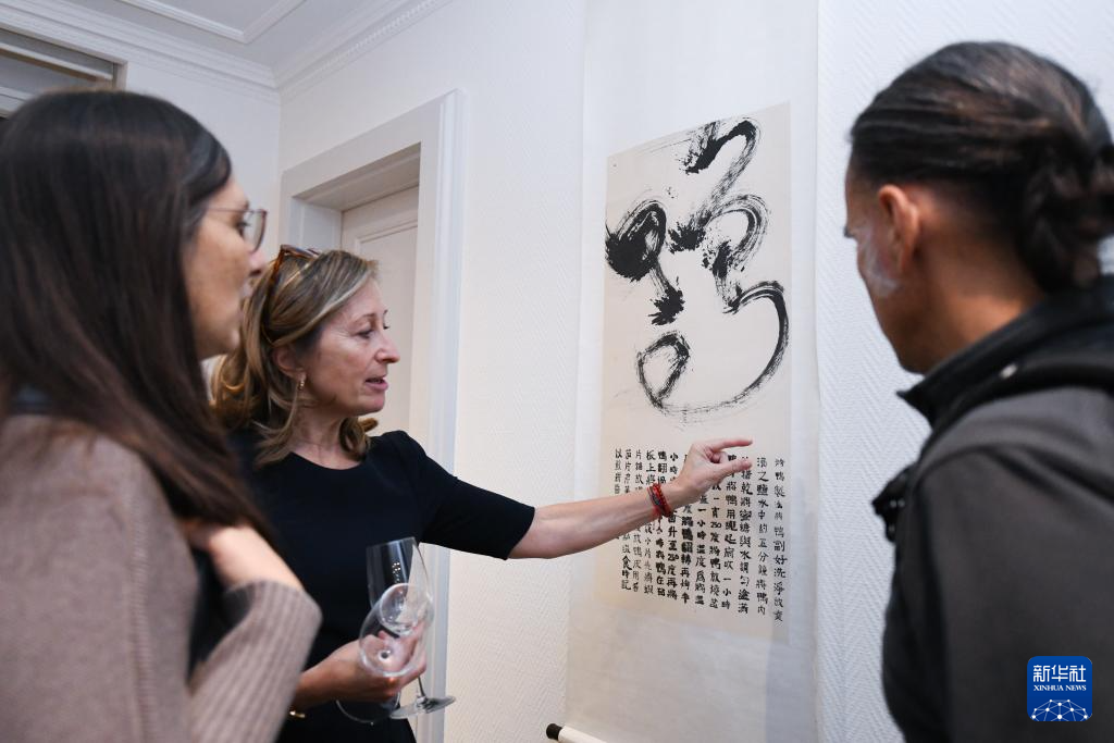 11月20日,在瑞士日內瓦,人們在“金秋”書法展上參觀。新華社記者 連漪 攝