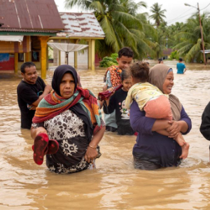 11月24日,在印度尼西亞西蘇門答臘省,人們在洪水中行走。