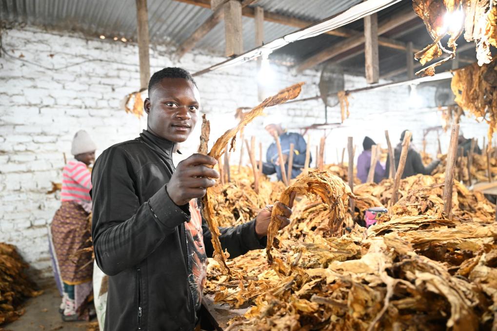 7月10日,在津巴布韋東馬紹納蘭省一座農場內,當地工人展示剛剛收獲的煙葉。新華社記者許正攝