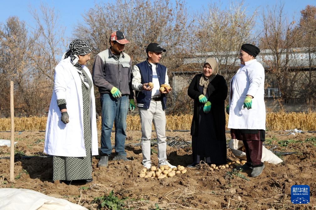 11月25日,在烏茲別克斯坦首都塔什干,烏茲別克斯坦科學院遺傳學與植物實驗生物學研究所人員在試驗田查看馬鈴薯。新華社發(扎法爾攝)