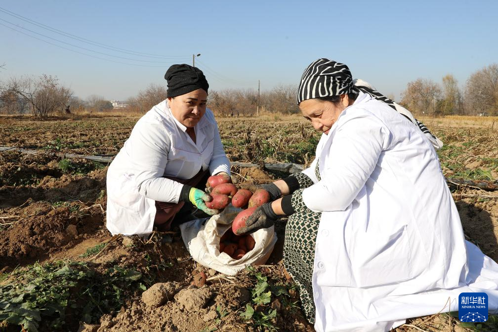 11月25日,在烏茲別克斯坦首都塔什干,烏茲別克斯坦科學院遺傳學與植物實驗生物學研究所人員在試驗田收獲馬鈴薯。新華社發(扎法爾攝)