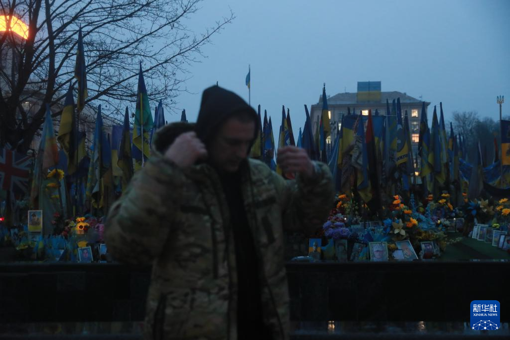 11月20日,在烏克蘭基輔,烏軍士兵基里洛·邦達連科在插滿悼念陣亡軍人旗幟的草坪前默哀后準備離開。新華社記者 李東旭 攝