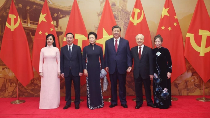 2015年以來,習近平總書記同阮富仲總書記三次互訪,佳節互致信函,并通過電話等多種方式保持密切交流溝通,為中越關系健康穩定發展掌舵領航。習近平總書記此次訪越期間,阮富仲總書記給予中國領導人最隆重的禮遇、最熱烈的歡迎。兩黨總書記共同出席多場活動,連續長時間深入交流。手拉手交談、肩并肩前行,正是相互敬重、高度互信的真情流露。[詳細]