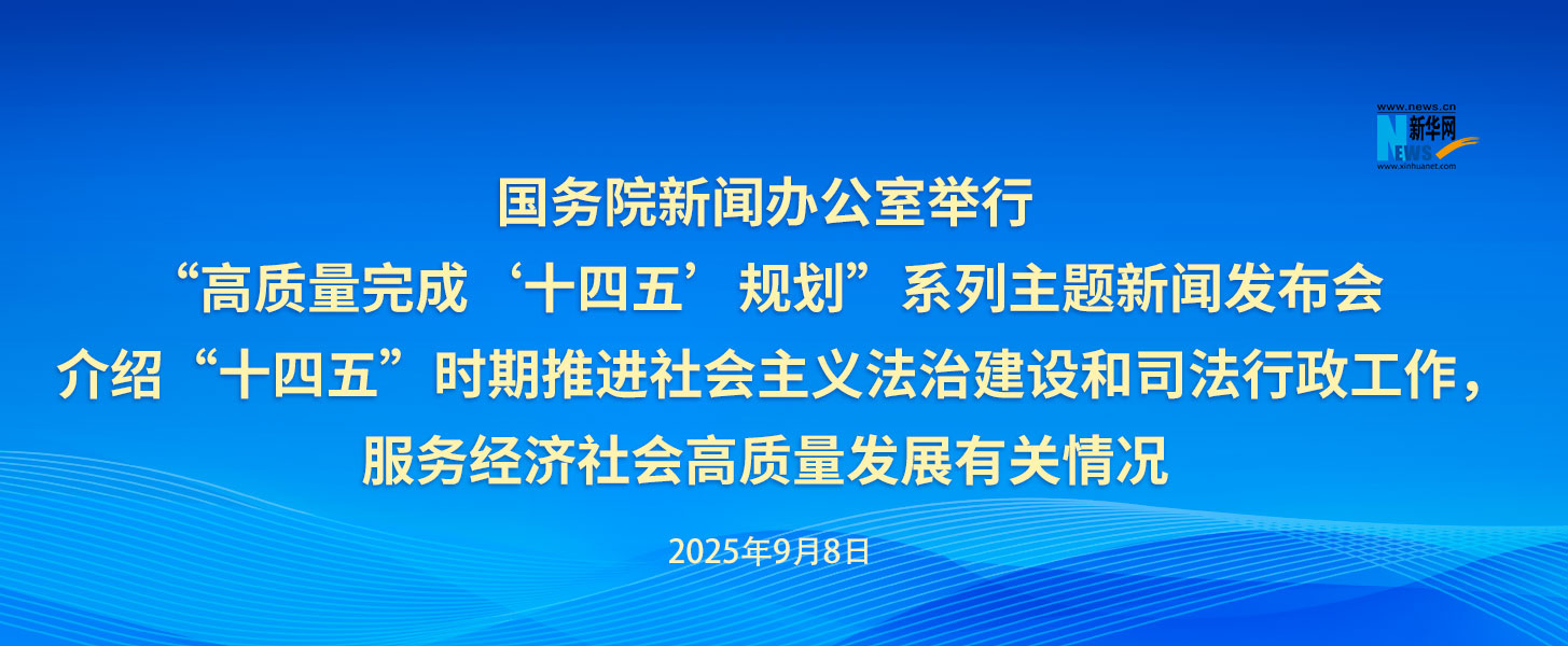 國務院新聞辦公室定于2025年9月8日(星期一)上午10時舉行“高質量完成‘十四五’規劃”系列主題新聞發布會,請司法部部長賀榮介紹“十四五”時期推進社會主義法治建設和司法行政工作,服務經濟社會高質量發展有關情況,并答記者問。