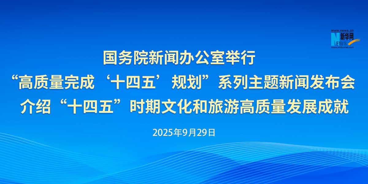 國務院新聞辦公室定于2025年9月29日(星期一)下午2時舉行“高質量完成‘十四五’規劃”系列主題新聞發布會,中央宣傳部副部長、文化和旅游部部長孫業禮介紹“十四五”時期文化和旅游高質量發展成就,并答記者問。