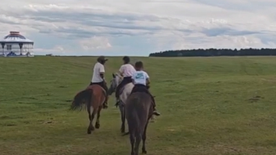 近期,在內蒙古呼倫貝爾市202省道的道樂都驛站附近的草場上,牧民將自己的兒女抱上馬背,騎馬走向遠方。
